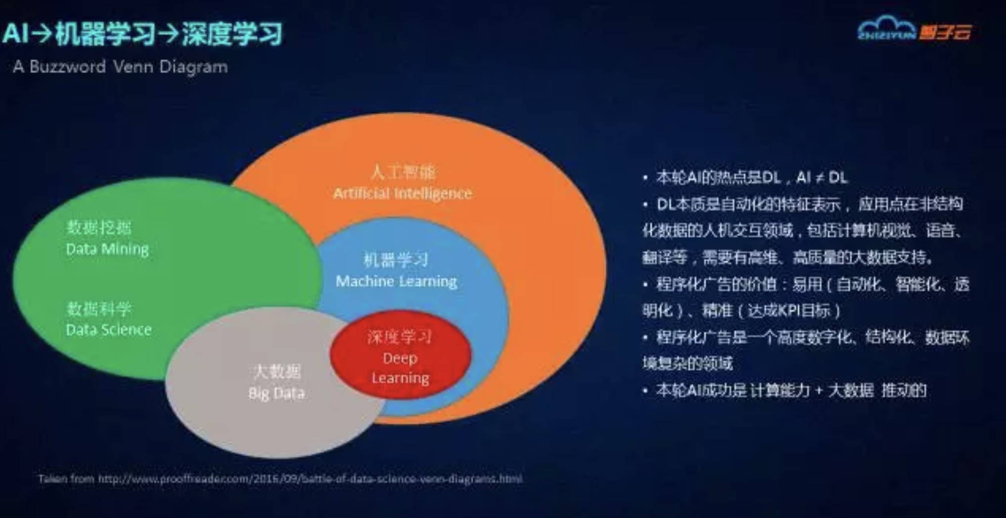首先,他用一幅图解释了AI、机器学习、数据挖掘、大数据、深度学习这些技术术语之间的关系。