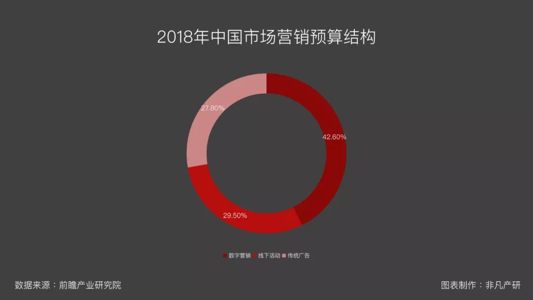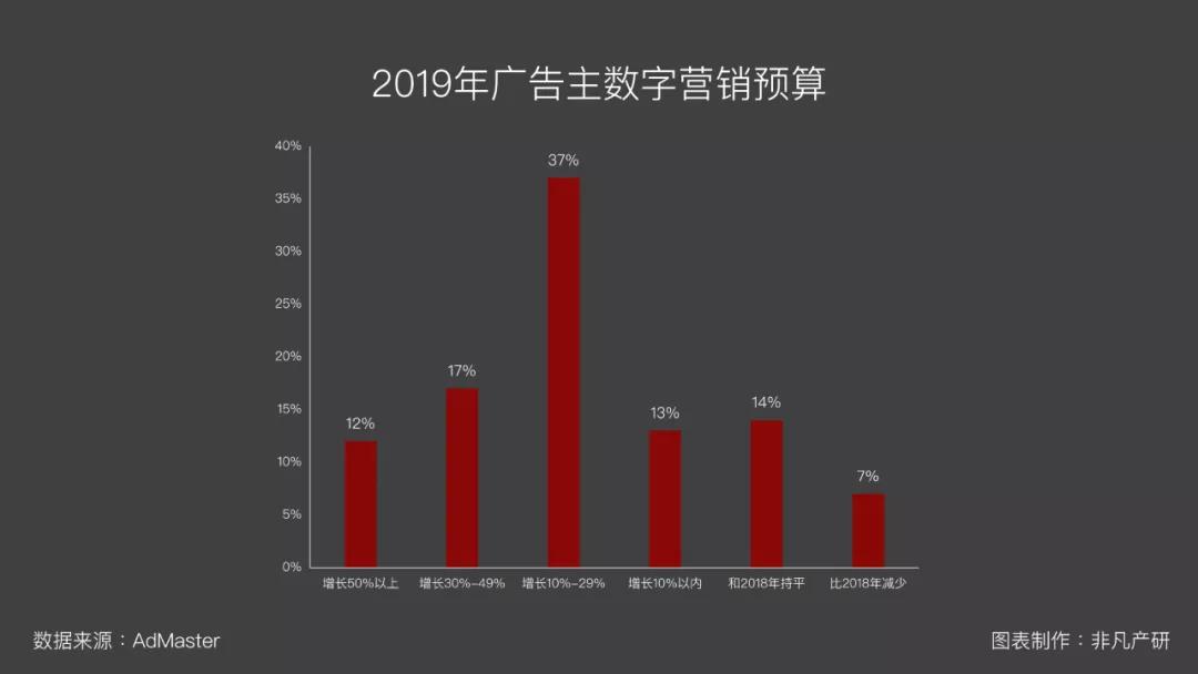 随着中国数字经济的崛起,数字营销凭借着自身优势也在飞速发展,获得广大市场主的认同。《2018年中国营销趋势研究》中的调研数据显示,数字营销目前在中国企业平均营销预算所占的比重从短短两年前的25.4%增至42.6%,涨幅惊人,而线下活动和传统广告在营销预算中所占的份额均出现下降,2018年分别为29.5%和27.8%。根据AdMaster发布的《2019年中国数字营销趋势》,2019年79%的广告主会选择增加数字营销投入,其中,选择增长10%-29%的比重最大,达到37%,总体预算平均增长20%。