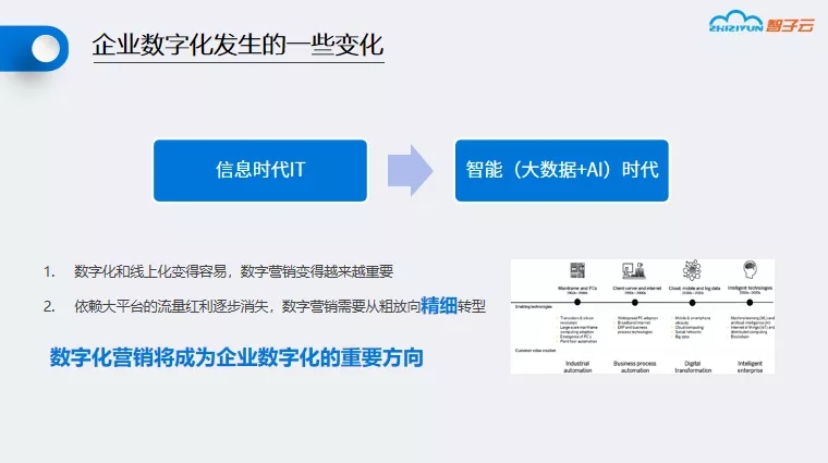 很高兴有机会在这里和大家分享“营销和数字化”的一些观点。讲之前我简单介绍一下智子云。智子云是一家面向数字营销领域的SaaS软件公司,通过一千多家渠道合作伙伴,服务了大概3、4万家最终客户。所以,我们一直处在软件行业和数字营销领域的交汇地带,也一直跟随着这两个领域的发展而成长。