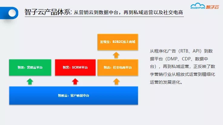 智子云的产品体系包括一个中台,三个前台。中台是将数据采集、数据处理、数据建模、数据利用等数据相关的功能和服务集成在一个平台上。三个前台依次是,公域引流的智效营销云,私域运营的智营SCRM系统,以及帮助企业快速线上化的智店社交电商平台。