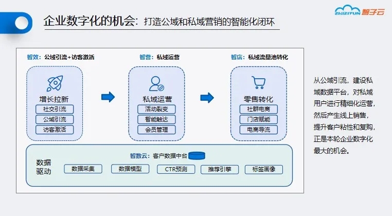从公域引流,建设私域数据平台,对私域用户进行精细化运营,然后产生线上销售,提升客户粘性和复购,正是本轮企业数字化最大的机会。