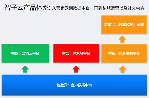 智子云的产品体系包括一个中台,三个前台。中台是将数据采集、数据处理、数据建模、数据利用等数据相关的功能和服务集成在一个平台上。三个前台依次是,公域引流的智效营销云,私域运营的智营SCRM系统,以及帮助企业快速线上化的智店社交电商平台。