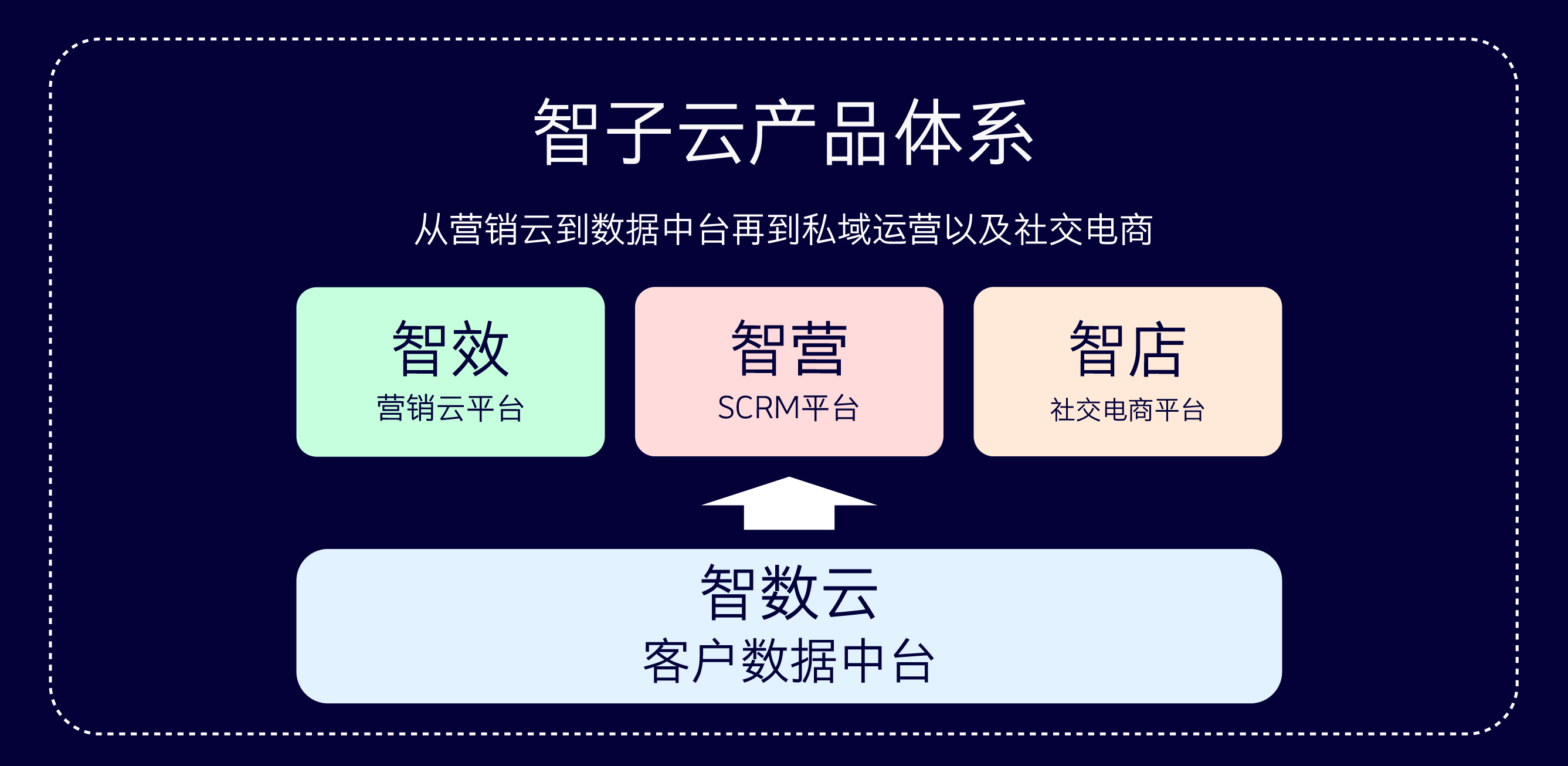 现有的产品体系包括一个中台,三个前台。中台是将数据采集、数据处理、数据建模、数据利用等数据相关的功能和服务集成在一个平台上。三个前台依次是,公域引流的智效营销云,私域运营的智营SCRM系统,以及帮助企业快速线上化的智店社交电商平台。