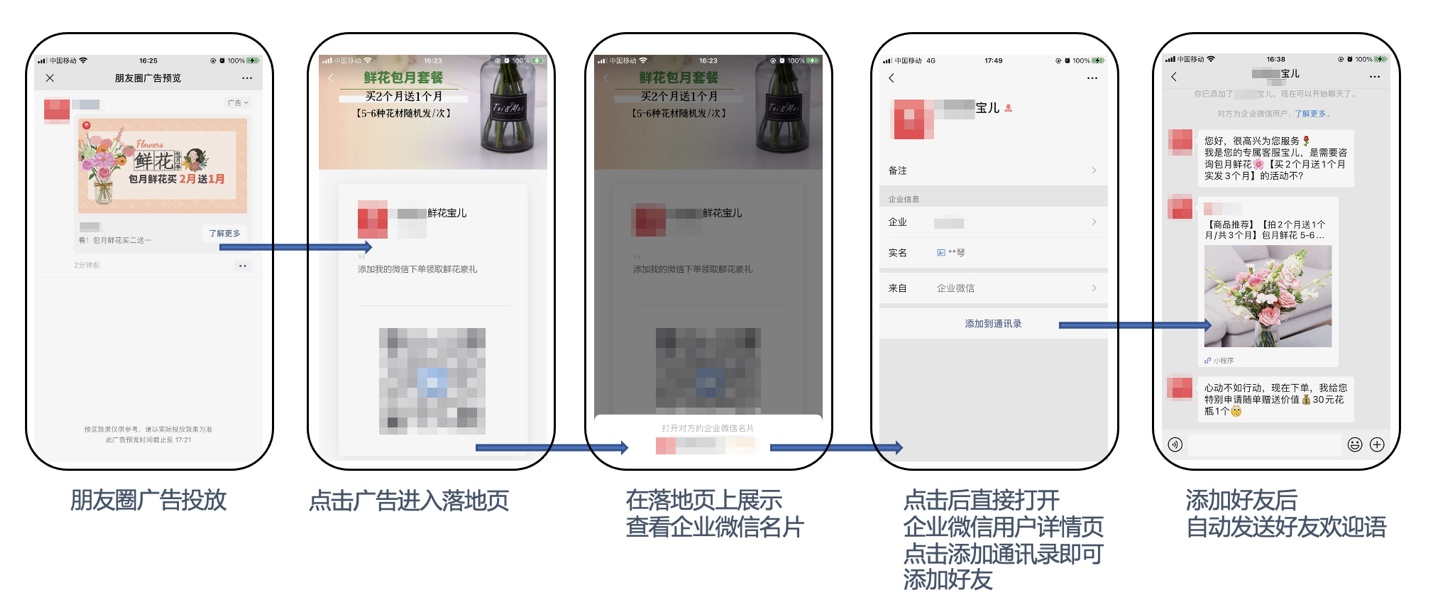 在设置完微信广告相关配置之后,一旦开始投放,企业会发现这是一件非常考验客服工作质量的事情。因为客户通过朋友圈广告进入落地页之后,如果对推广的利益点(比如上述实例图中的“添加我的微信下单领取鲜花豪礼”)感兴趣,就会主动扫码添加客服微信。这里对客服工作有两个要求,首先是及时响应,客户一完成添加就要主动打招呼并把利益点相关事项表达清楚。其次是能做到基于不同的推广页面来演示,客服能做到无差错的针对性响应。以示例中的鲜花网店为例,在同一波推广活动中会有不同的推广页面,对应不同的推广利益点。比如有的是新客低价领取鲜花,有的是老客下单赠送花瓶。不同的客户是扫描不同落地页的二维码添加好友的,因此添加之后客服需要能准确识别来源,并快速切入对应的利益点沟通。