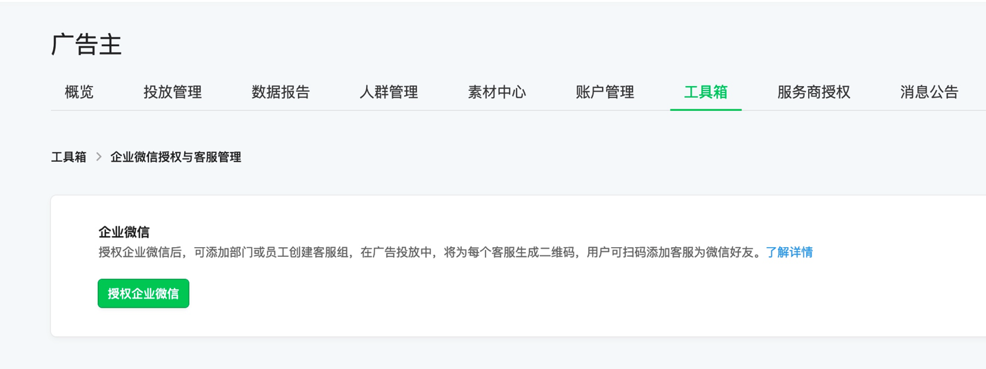 开户完成之后,需要进行企业微信的绑定和客服组设置操作。我们需要进入朋友圈广告平台的工具箱界面,先进行朋友圈广告和企业微信的绑定操作,如下图所示。