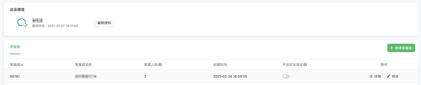 点击授权企业微信按钮,按向导提示完成企业微信的授权绑定操作。绑定完成后页面状态如下图所示: