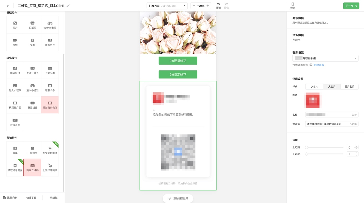 客服组创建好之后,在微信广告的落地页制作工具中,就可以直接在页面上添加客服联系或者xx组件,当用户点击或者扫码时即可直接添加企业成员为好友进行进一步沟通。下图演示了如何在微信广告落地页上创建客服联系组件。