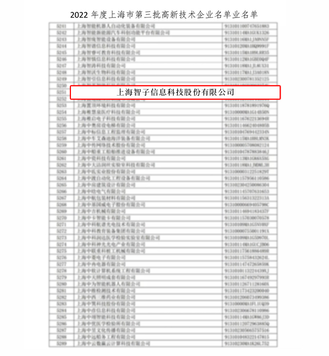 2022年11月14日,上海市科学技术委员会将2022年度上海市第三批符合认定条件的5802家拟认定高新技术企业名单予以公示,智子云位列其中,通过2022年度上海市第三批高新技术企业认定,继2019年之后再次被认定为高新技术企业。