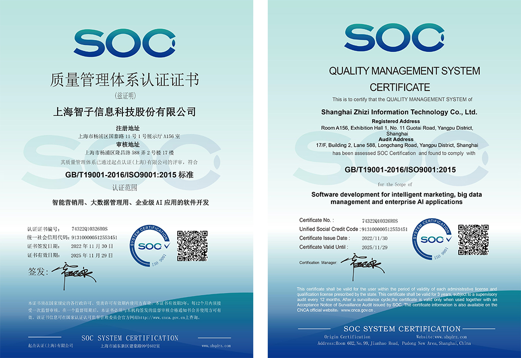 2022年11月30日,上海智子信息科技股份有限公司顺利通过起点认证(上海)的专项审核,正式获得GB/T19001-2016/ISO9001:2015标准质量管理体系认证证书,这标志智子云在智能营销、大数据管理、企业级AI应用的软件开发向着国际化、标准化、规范化开发迈进了一大步。