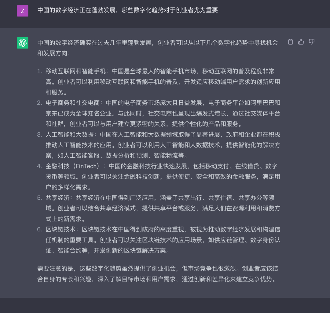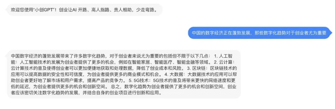 上图为小创GPT和ChatGPT4.0 对于当前行业趋势的解读,可以看出小创GPT对中国数字化趋势解读中,能更加紧跟潮流,对创业者更有指导性,反观ChatGPT的回答会更加‘官方’,实际指导意义不大。