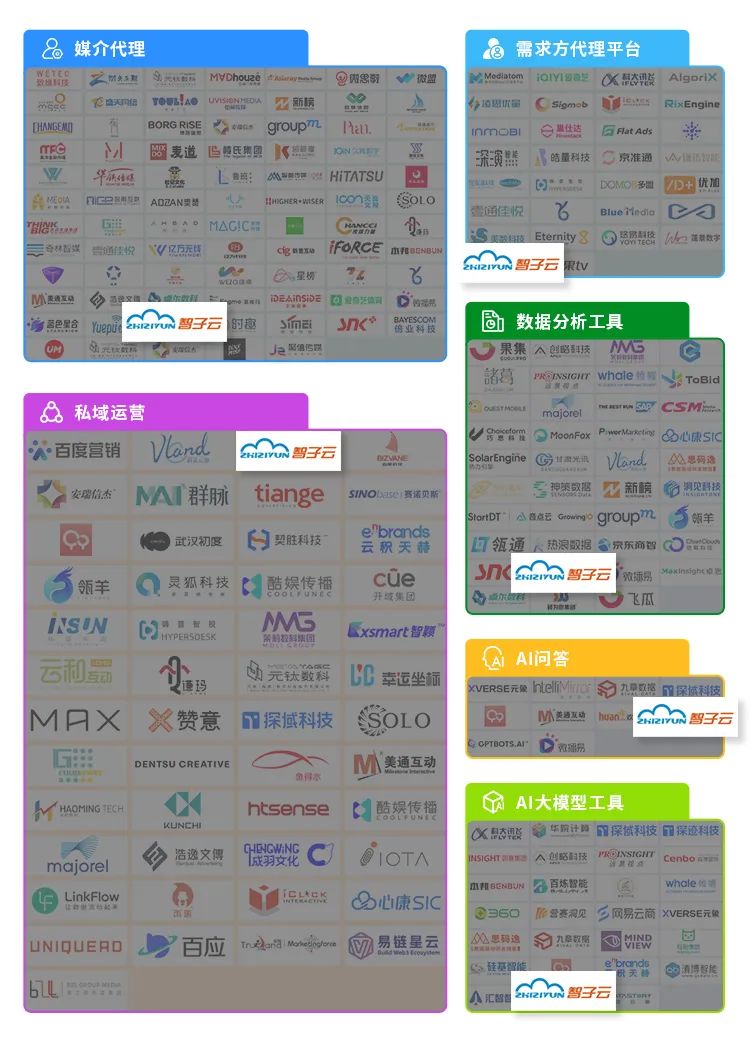 其中,智子云以领先的智能营销、大数据管理和AI智能服务能力成功入选媒介代理、需求方代理平台、私域运营、AI问答、AI大模型工具和数据分析工具六大关键赛道,智子云在数字营销领域所做的创新与突破再次得到行业、协会的高度认可。