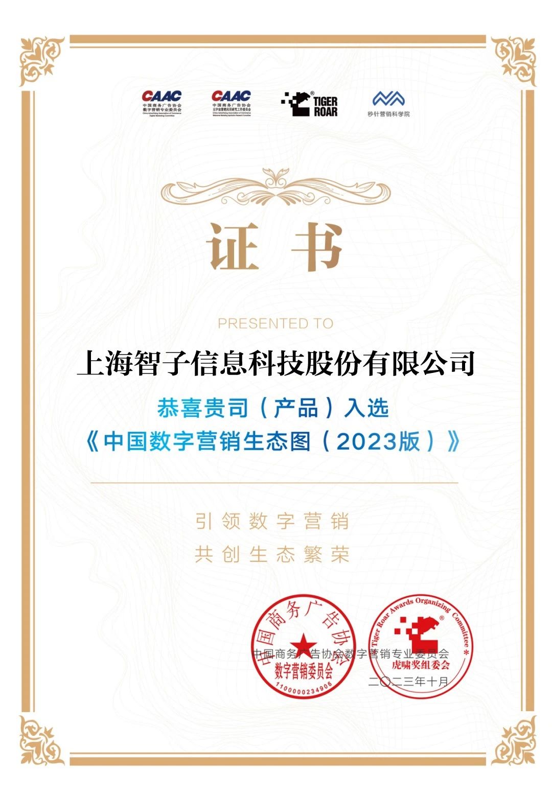 近日,中国商务广告协会数字营销专业委员会、中国商务广告协会元宇宙营销应用研究工作委员会、虎啸奖组委会、秒针营销科学院、虎啸传媒等多方合作的《中国数字营销生态图2023版》(以下简称:生态图)正式发布,智子云凭借在数字营销领域多年的专业能力和实战经验等优势成功入选多个赛道。