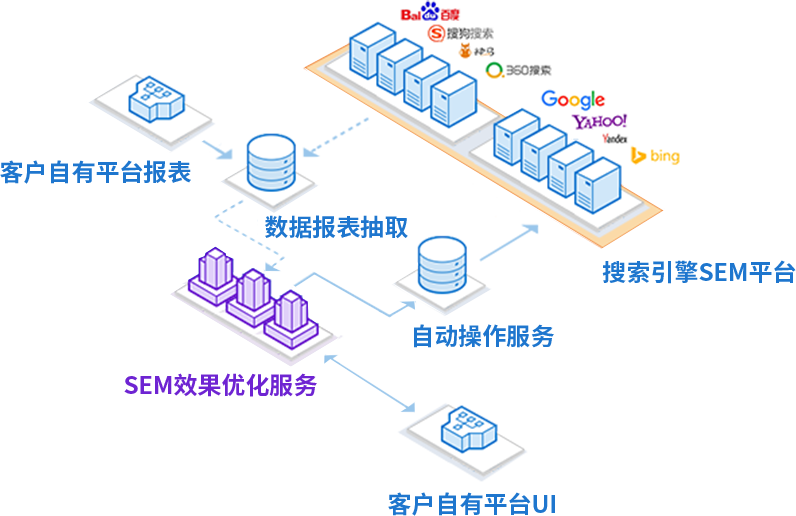 搭建统一的管理平台,集成多个搜索引擎SEM平台,自动跨渠道分析投放效果,极大降低人力成本和分析难度。